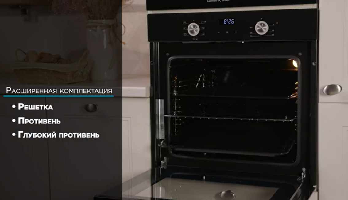 • дополнительная комплектация — противни, термощупы, вертелы, решетки для гриля;
