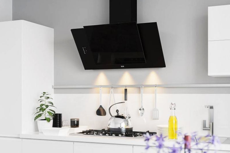 - Настенные — самая большая категория с креплением к стене над плитой, над которой нет верхнего шкафчика, от недорогих плоских до удобных наклонных и оригинальных дизайнерских.