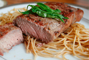 Из маленьких кусков мяса можно сделать шницели или стейки, а также просто нарезать продукт на небольшие брусочки. 1-2 минуты жарить на сковородке, затем довести до готовности в подогревателе посуды.