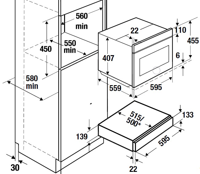 Размеры ниши для встраивания: 59.5x56х55 см (включая прибор высотой 45 см)