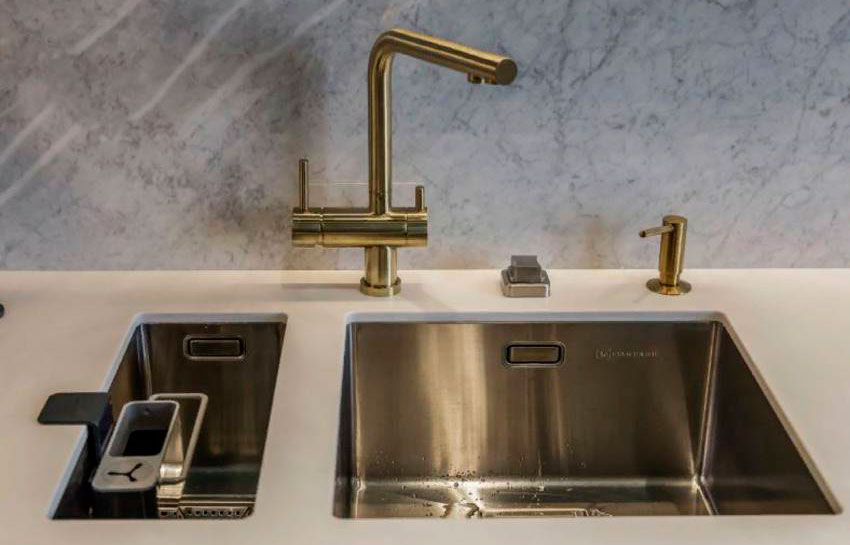 Дозатор для моющего средства в цвет мойки и смесителя.