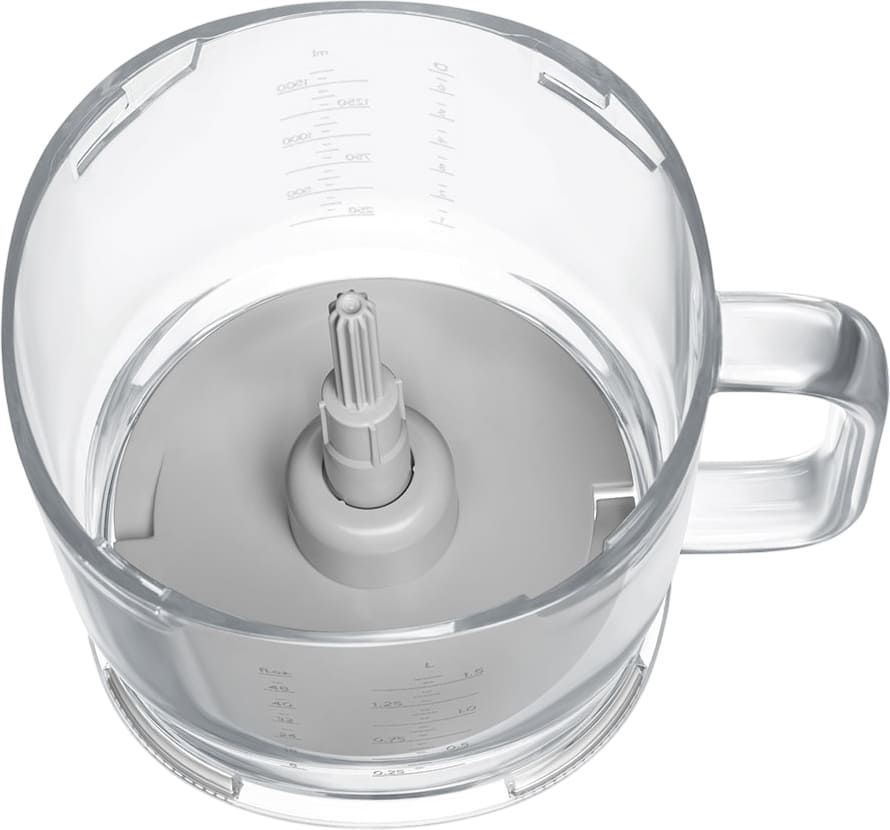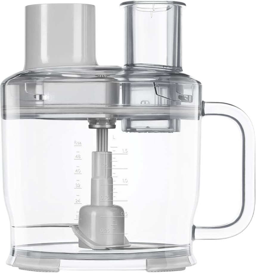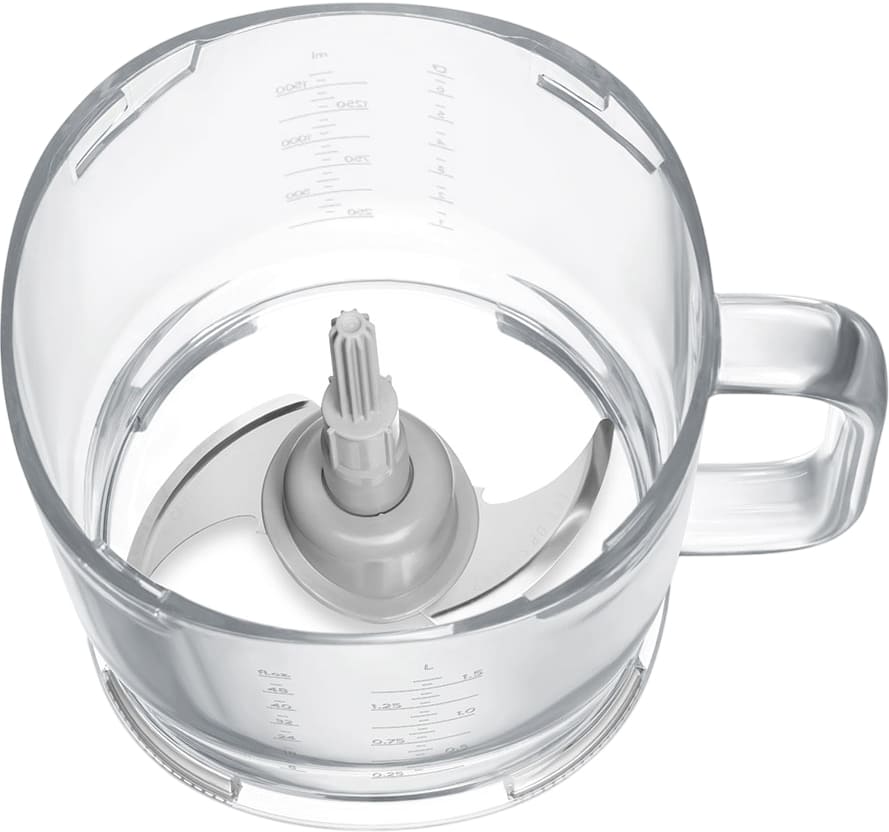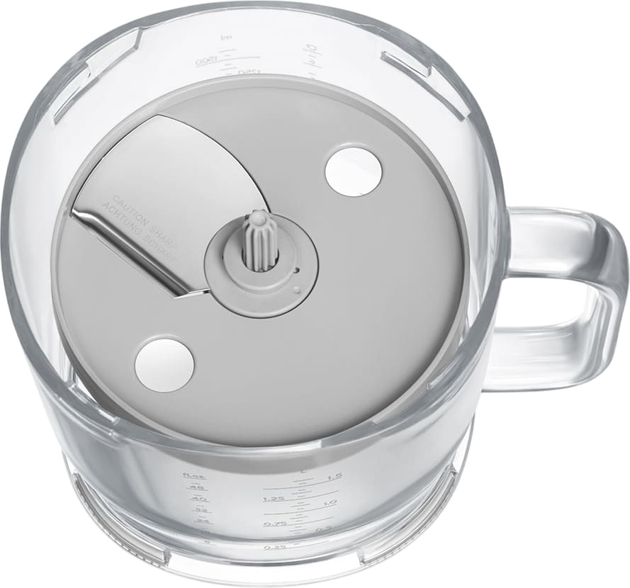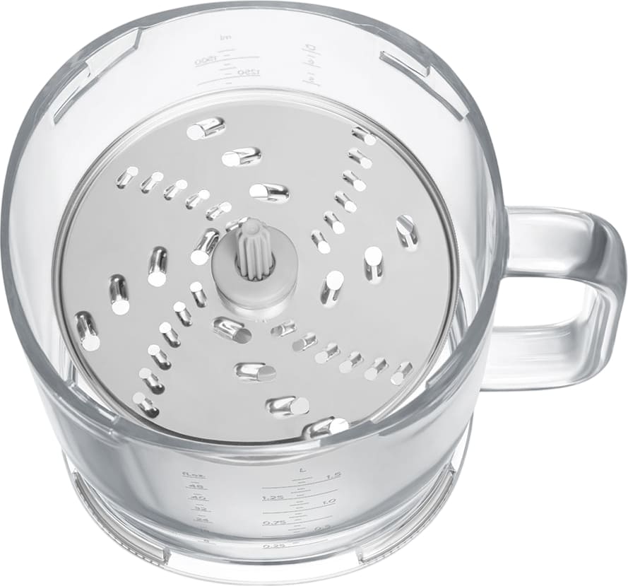 Многофункциональный измельчитель 5 в 1: нарезает ломтиками, режет, натирает и эмульгирует. Он состоит из градуированной чаши, диска для нарезки ломтиками, эмульгирующего диска,