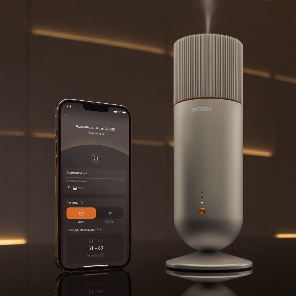 Аромастанция BORK A630 — компактный и стильный ультразвуковой диффузор, предназначенный для равномерного распыления ароматов на площади до 100 м². Устройство оснащено тремя режимами интенсивности, поддерживает управление через фирменное приложение BORK и совместимо с голосовым помощником Алиса от Яндекса, что делает его частью экосистемы умного дома.