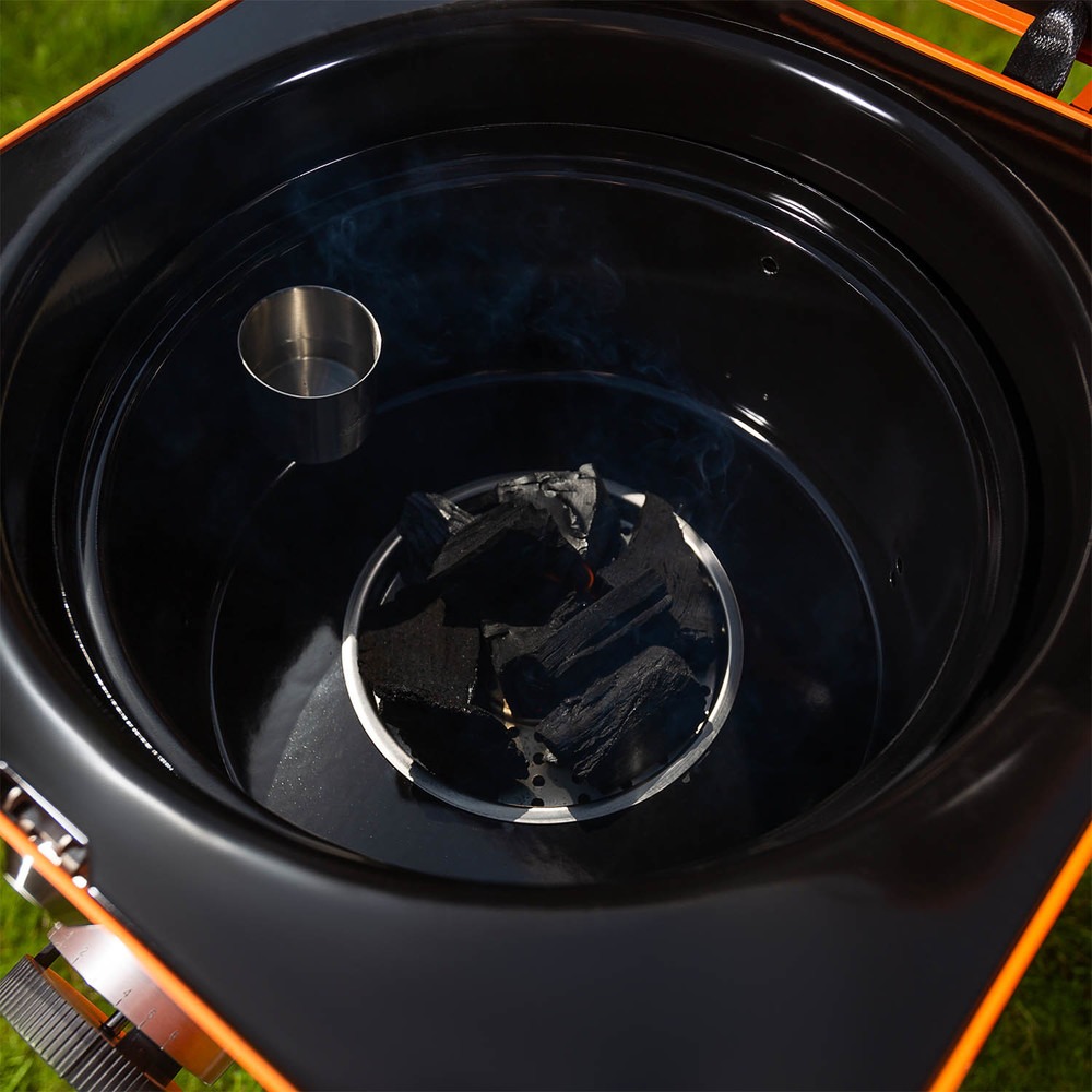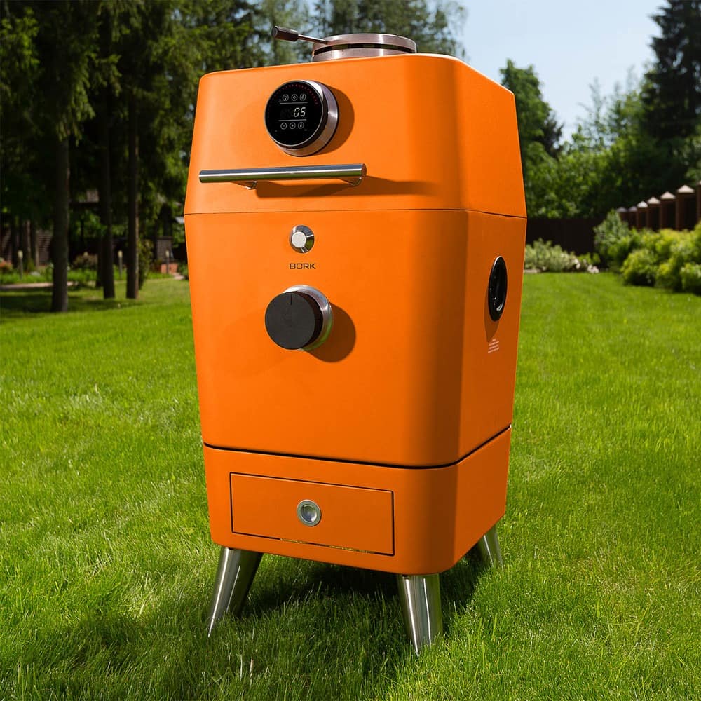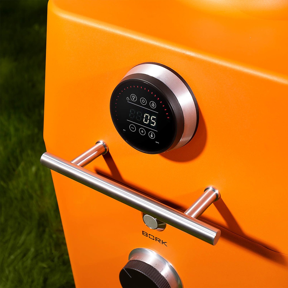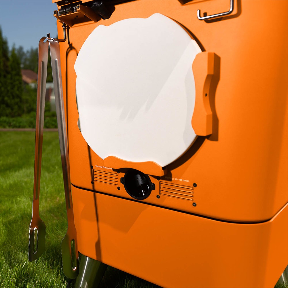 Уличный угольный гриль в ярком оранжевом корпусе. В нем можно обжаривать мясо, овощи и даже запекать пиццу на специальном камне (уже в комплекте). Сенсорная панель управления простая и наглядная.