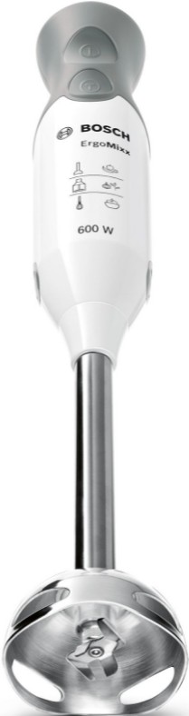 Погружной блендер Bosch позволяет готовить смузи, коктейли, смешивать соусы и заправки и многое другое. Такая конструкция требует вашего участия — нужно держать рукоятку с насадкой и контролировать направление движения. Плюс в том, что можно использовать ее прямо в кастрюле, когда готовите, например, суп-пюре. Корпус сделан в основном из пластика, что уменьшает вес прибора. Он может как влиться в общую гамму интерьера, так и стать ярким акцентом; доминирующий цвет — белый.