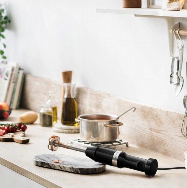 Погружной блендер KitchenAid позволяет готовить смузи, коктейли, смешивать соусы и заправки и многое другое. Такая конструкция требует вашего участия — нужно держать рукоятку с насадкой и контролировать направление движения. Плюс в том, что можно использовать ее прямо в кастрюле, когда готовите, например, суп-пюре. Корпус сделан в основном из пластика, что уменьшает вес прибора. Он может как влиться в общую гамму интерьера, так и стать ярким акцентом; доминирующий цвет — черный.