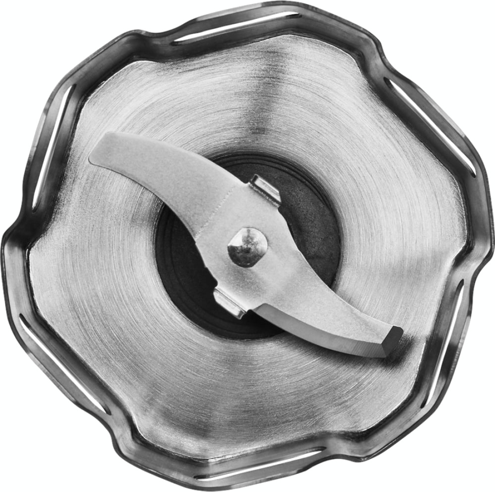 Прибор выполнен в чистом белом цвете, что придаёт ему лаконичный и универсальный внешний вид, легко вписывающийся в любой кухонный интерьер. Корпус изготовлен из прочного пластика, устойчивого к повреждениям и простого в уходе, а погружная часть — из гигиеничной нержавеющей стали, не подверженной коррозии и сохраняющей остроту лезвий даже при интенсивном использовании. В комплект входит мерный стакан объёмом 0,7 литра из качественного пластика, который одновременно служит ёмкостью для измельчения и удобной тарой для дозирования компонентов.