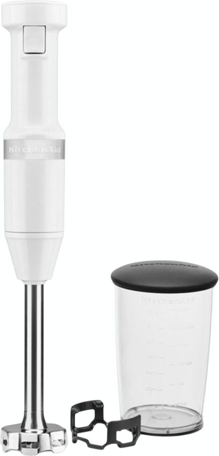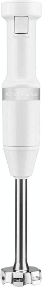 Стационарный блендер KitchenAid 5KHBV53EWH белого цвета — несмотря на указанное в названии определение, на самом деле представляет собой удобный погружной блендер, сочетающий в себе мобильность, элегантный дизайн и высокую функциональность. Модель оснащена двигателем мощностью 180 Вт, что обеспечивает эффективную работу при обработке различных продуктов. Диапазон скоростей вращения насадки составляет от 8250 до 11 000 оборотов в минуту, что позволяет точно регулировать интенсивность измельчения в зависимости от консистенции ингредиентов — будь то нежное пюре, густой соус или освежающий коктейль.