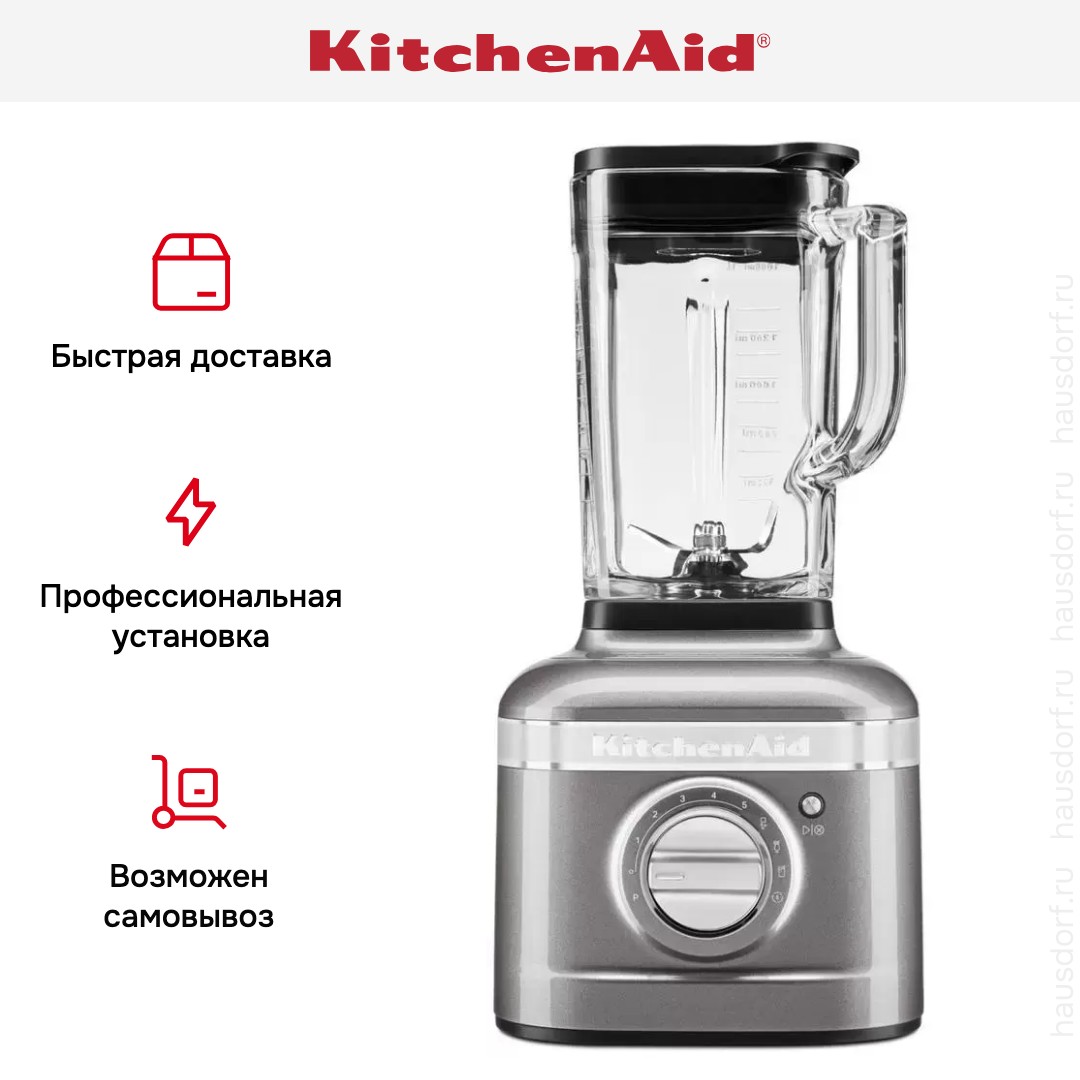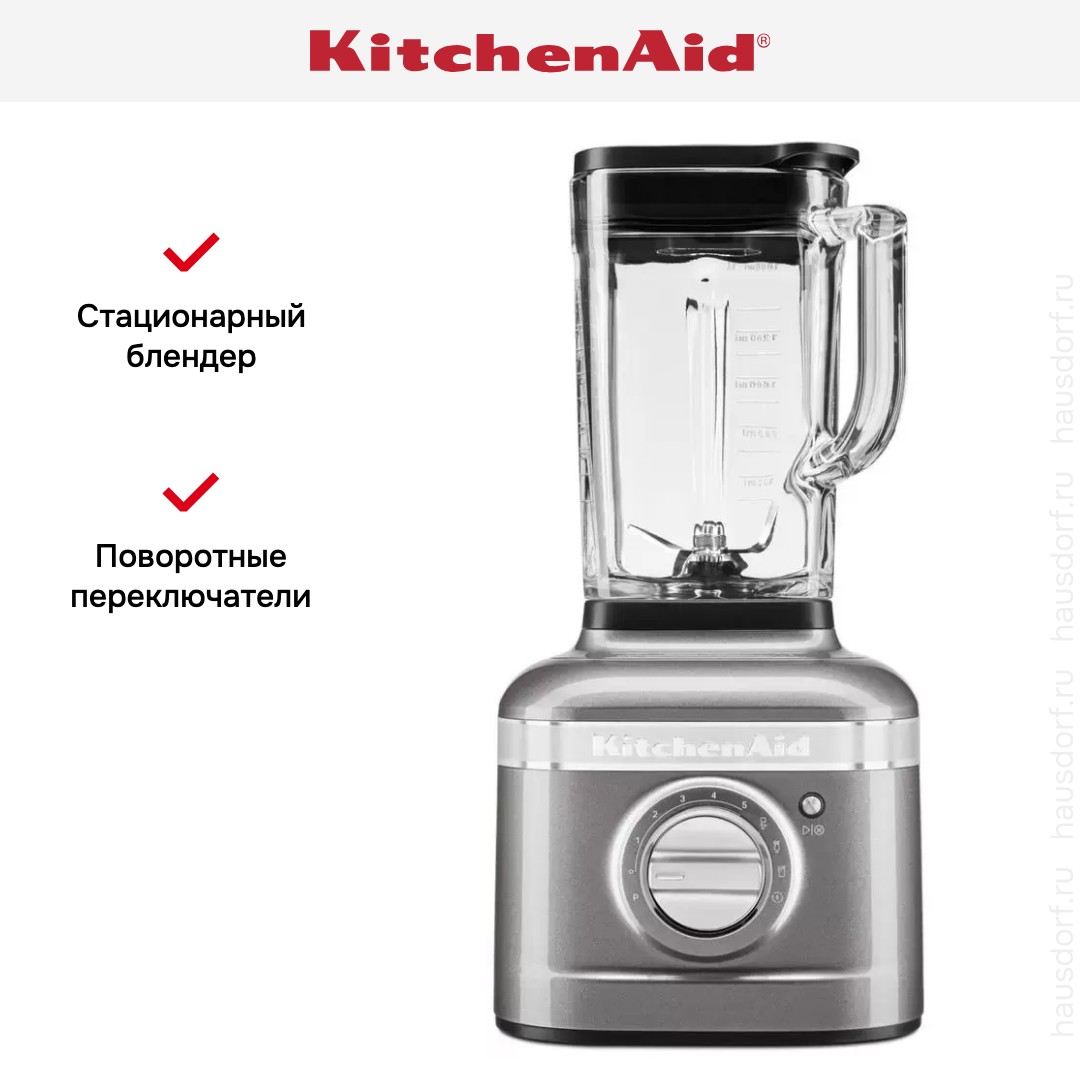 Стационарный блендер KitchenAid позволяет готовить смузи, коктейли, смешивать соусы и заправки, измельчать продукты до состояния пюре и многое другое. Его конструкция подразумевает автономную работу — вам нужно только положить овощи или фрукты и выбрать режим. Он может как влиться в общую гамму интерьера, так и стать ярким акцентом; доминирующий цвет — серебряный медальон.