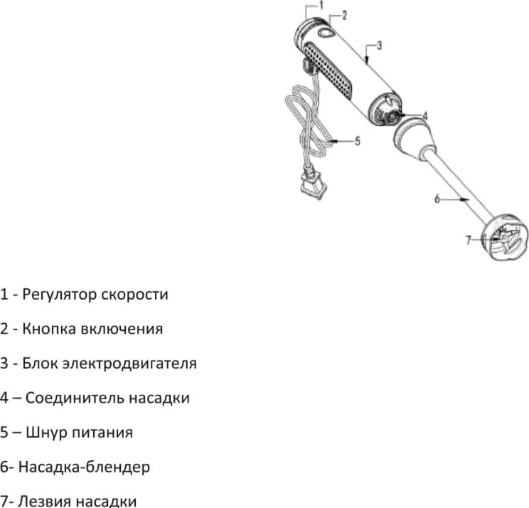 Погружной блендер — устройство, служащее прежде всего для измельчения продуктов, и также для смешивания, взбивания, дробления. Он состоит из корпуса с двигателем, ножки и сменных насадок в нижней части. Насадка-нож погружается в емкость с продуктом, после сего блендер включается для измельчения.
