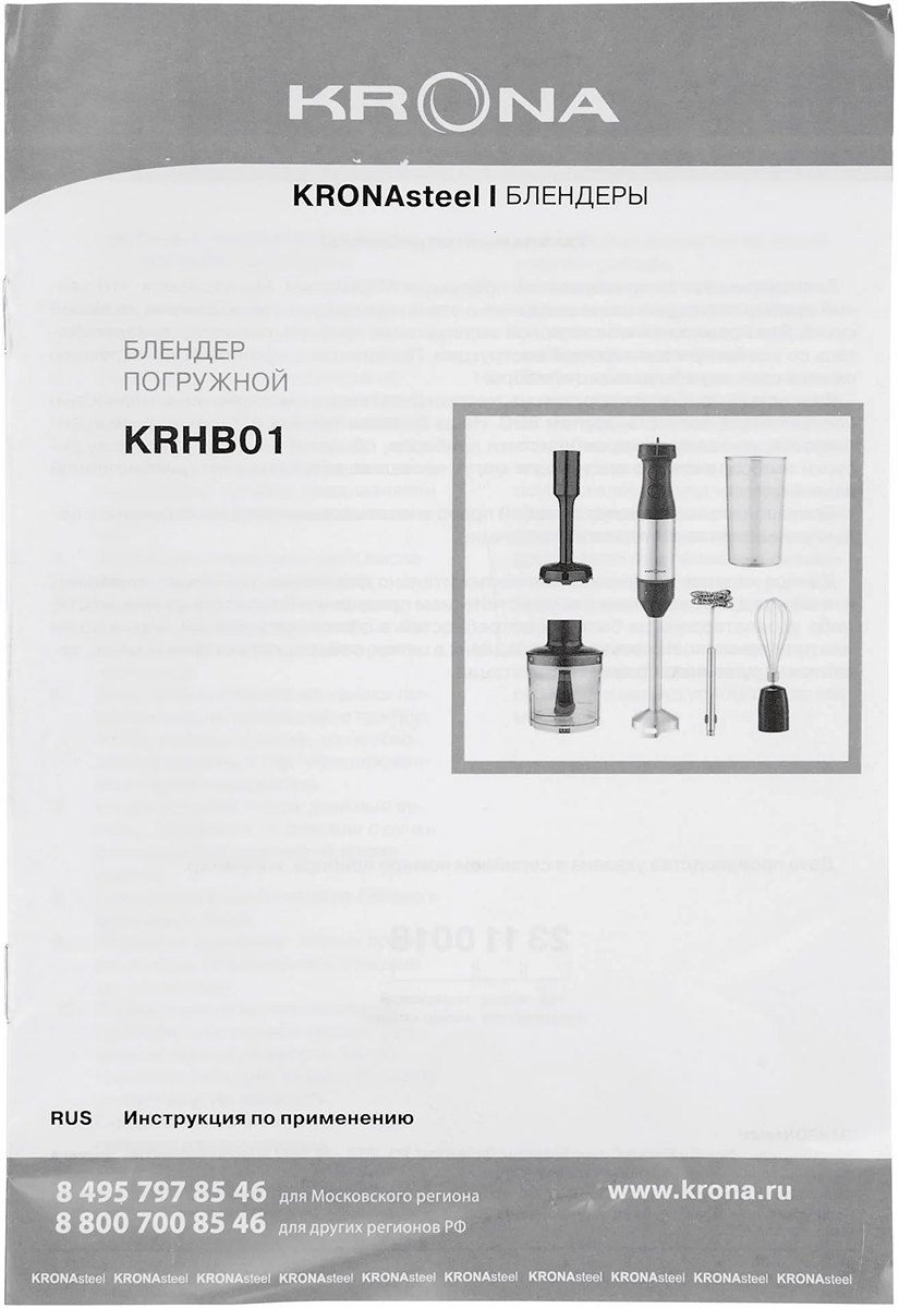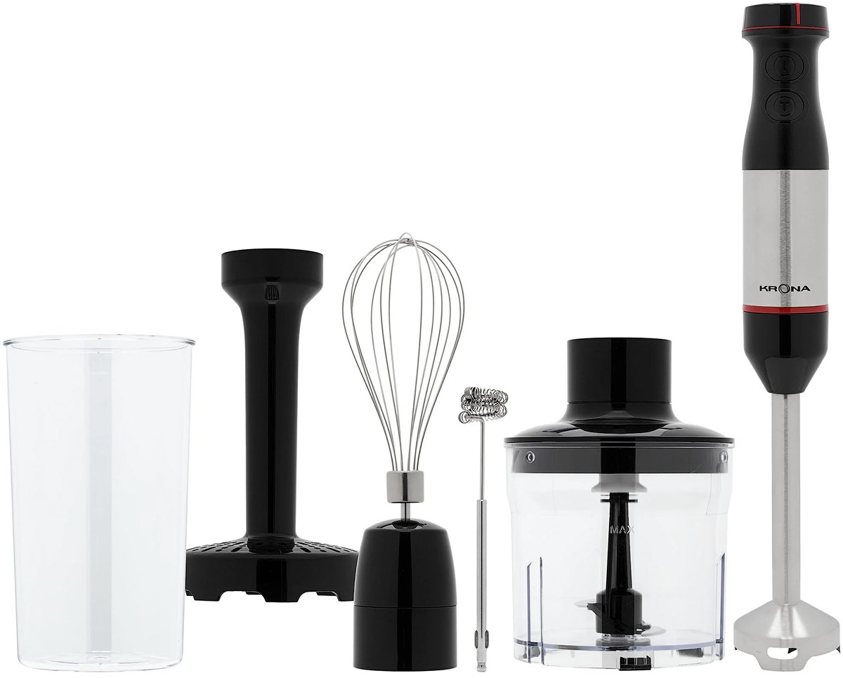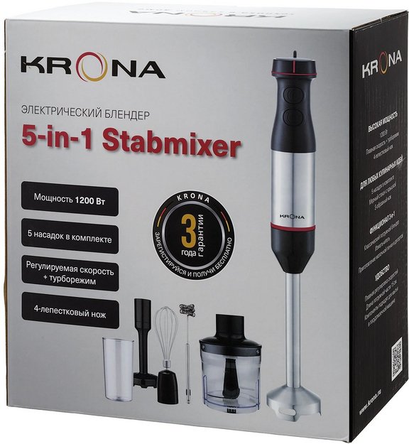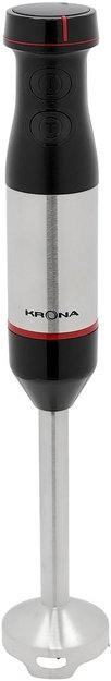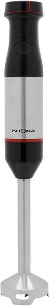 Погружной блендер KRONA позволяет готовить смузи, коктейли, смешивать соусы и заправки и многое другое. Такая конструкция требует вашего участия — нужно держать рукоятку с насадкой и контролировать направление движения. Плюс в том, что можно использовать ее прямо в кастрюле, когда готовите, например, суп-пюре. Корпус сделан в основном из пластика, что уменьшает вес прибора. Он может как влиться в общую гамму интерьера, так и стать ярким акцентом; доминирующий цвет — черный/нержавеющая сталь.