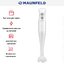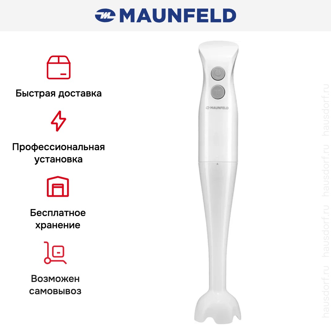 Погружной блендер Maunfeld позволяет готовить смузи, коктейли, смешивать соусы и заправки и многое другое. Такая конструкция требует вашего участия — нужно держать рукоятку с насадкой и контролировать направление движения. Плюс в том, что можно использовать ее прямо в кастрюле, когда готовите, например, суп-пюре. Корпус сделан в основном из пластика, что уменьшает вес прибора. Он может как влиться в общую гамму интерьера, так и стать ярким акцентом; доминирующий цвет — белый.