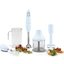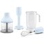 Блендер имеет в комплектации чашу для измельчения, собственно, сам измельчитель, венчик и насадку для пюре. Погружная часть сделана из нержавеющей стали. Благодаря системе FlowBlend блендер может работать с продуктами разной степени плотности, ножи легко моются и их не нужно затачивать. На пластиковой основе есть кнопка для переключения скоростей, а также кнопка для работы в Turbo-режиме.Тритановая чаша с крышкой оснащена маркировкой в литрах и унциях, что делает еще более удобным её использование.
