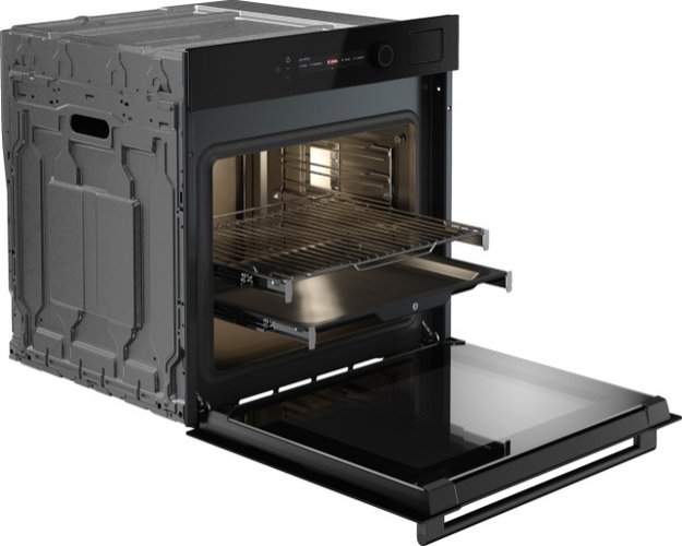 Особенности дизайна и внешней панели управления — также важный пункт при выборе духовки на кухню. В данной модели нужно обратить внимание на цвет — черное стекло, охлаждение двери, чтобы поверхность и мебель вокруг не нагревались.