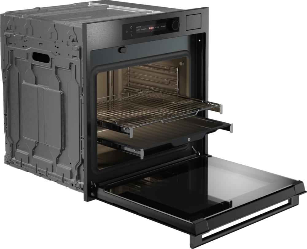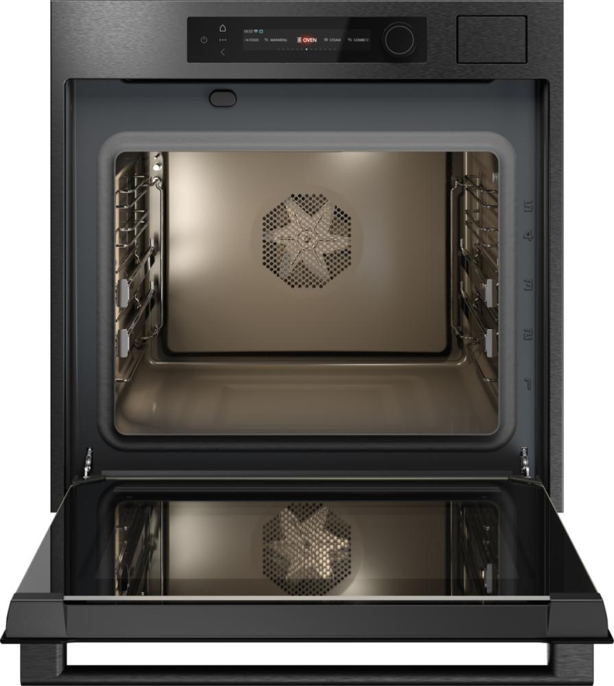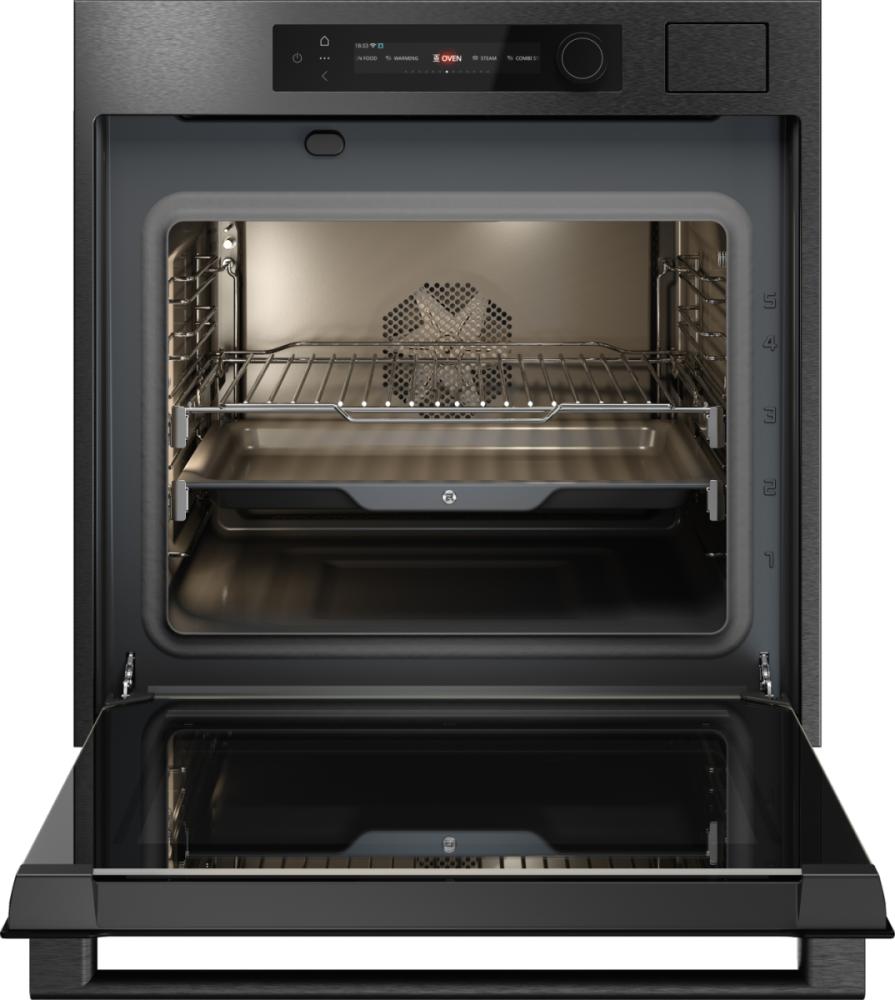 Особенности дизайна и внешней панели управления — также важный пункт при выборе духовки на кухню. В данной модели нужно обратить внимание на цвет — черная сталь, охлаждение двери, чтобы поверхность и мебель вокруг не нагревались.
