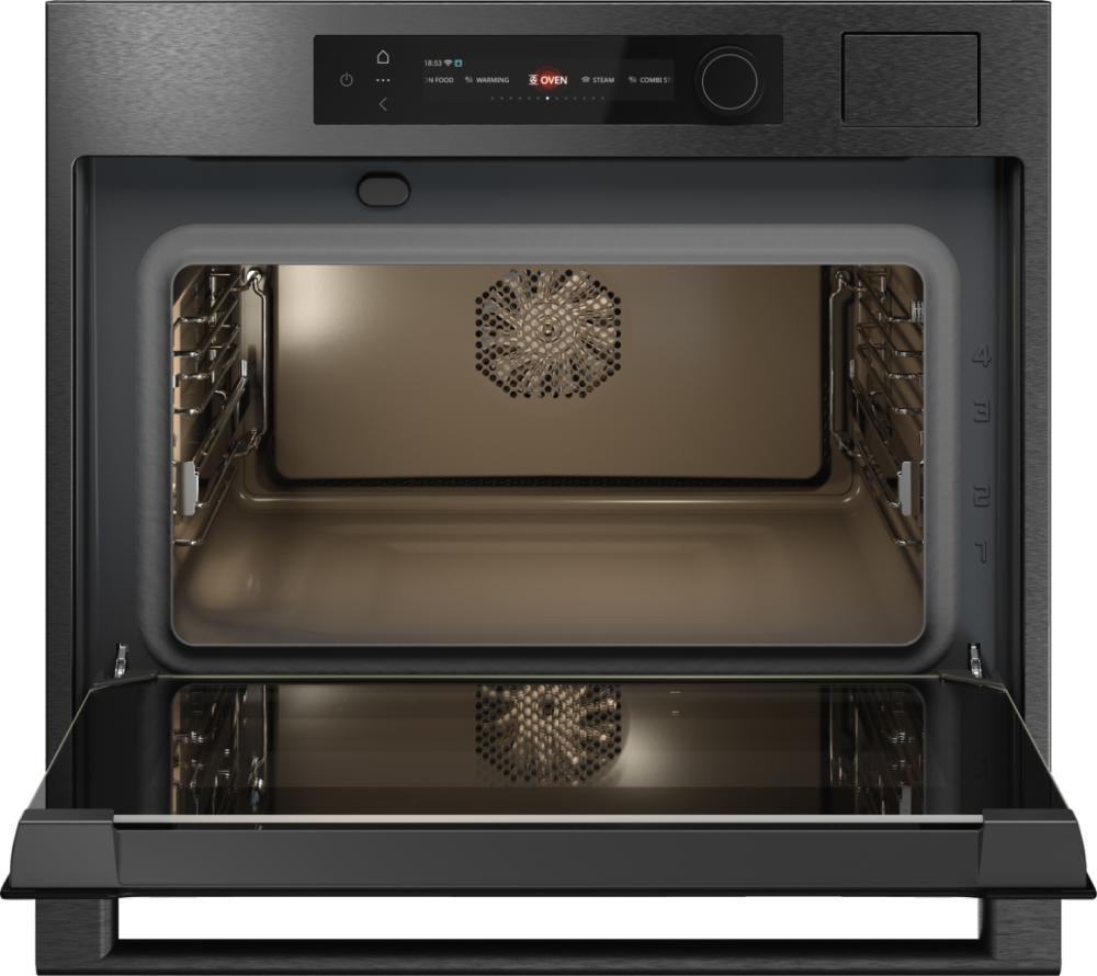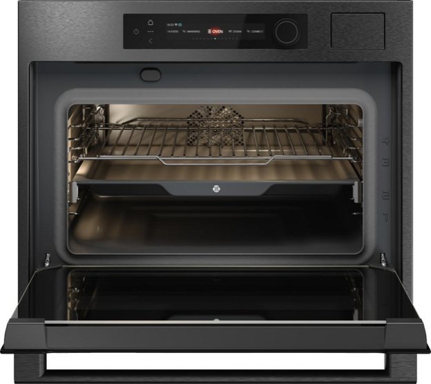 Особенности дизайна и внешней панели управления — также важный пункт при выборе духовки на кухню. В данной модели нужно обратить внимание на цвет — черная сталь,