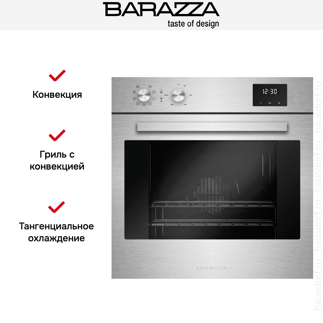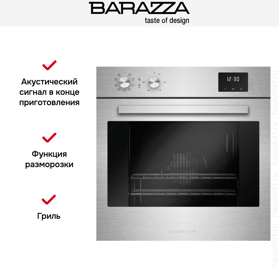 Духовой шкаф Barazza 1FOAP — это элегантное и технологичное устройство, созданное для тех, кто ценит итальянский дизайн, надёжность и инновационные решения на кухне. Модель относится к независимому типу, что позволяет размещать её в любом удобном месте без привязки к варочной поверхности. Подключение осуществляется к электрической сети, что обеспечивает стабильную и безопасную работу. Габариты корпуса составляют 59,6 см в высоту, столько же в ширину и 54,5 см в глубину, что соответствует стандартам встраиваемой техники премиум-класса. Для правильной установки требуется ниша размером 58 × 56 × 55 см, что гарантирует плотное прилегание, эффективную вентиляцию и эстетичный внешний вид после монтажа. Управление осуществляется с помощью сенсорной панели, дополненной поворотными регуляторами и сенсорными кнопками TouchControl, что делает взаимодействие с прибором интуитивно понятным, точным и визуально привлекательным. Такой подход сочетает в себе удобство механической настройки и современные цифровые возможности, обеспечивая полный контроль над процессом приготовления. Благодаря продуманной конструкции и компактным размерам духовка гармонично вписывается в любой интерьер, не нарушая его стилистическую целостность. При этом внутренний объем остается достаточно вместительным для повседневных и праздничных задач. Равномерный нагрев, обеспечиваемый электрической системой, позволяет готовить блюда с идеальной пропеченностью и текстурой. Модель подойдет как для традиционной выпечки, так и для экспериментов с новыми кулинарными техниками. Надежная сборка, качественные компоненты и внимание к деталям делают этот прибор долговечным и практичным в повседневной эксплуатации. Он станет не просто техникой, а стильным элементом кухонного пространства, подчёркивающим вкус владельца. Выбирая эту модель, вы получаете сочетание итальянской эстетики, передовых технологий и функциональности, способное удовлетворить даже самых взыскательных гурманов.