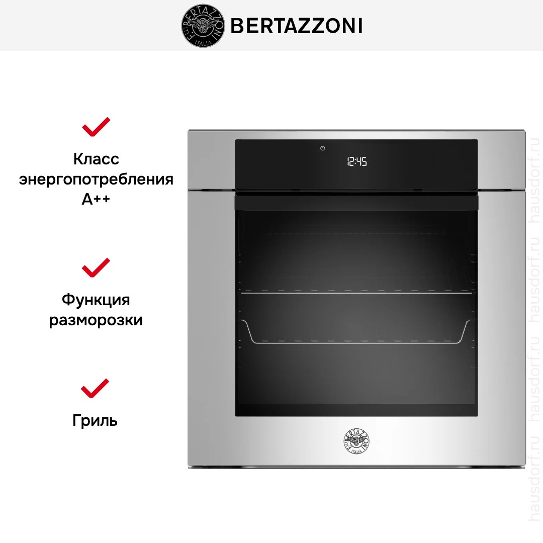 Bertazzoni F6011MODPLX — встраиваемый духовой шкаф с пиролитической очисткой. Предусмотрено 11 режимов приготовления, среди которых функции: гриль с конвекцией, нижний нагрев, турбо, выпечка и другие. Управление происходит с помощью удобного сенсорного LCD-дисплея. Готовка возможна сразу на 5 уровнях.
