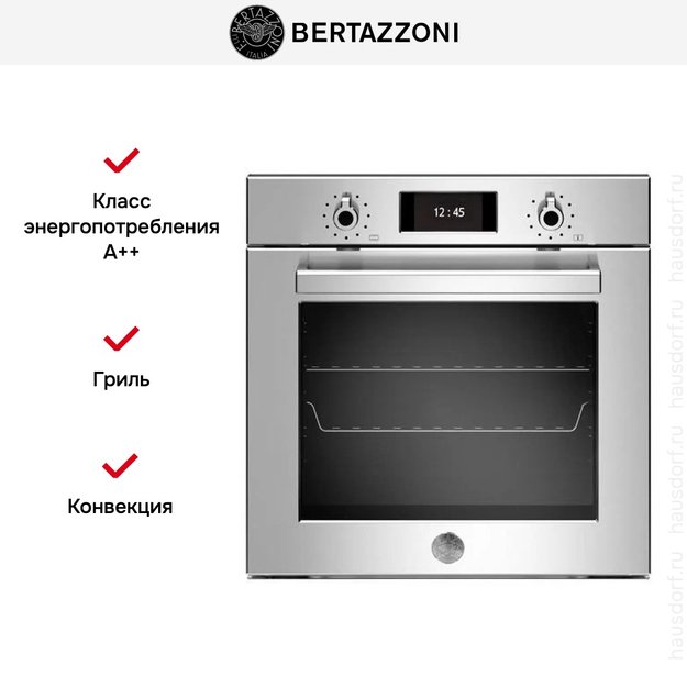 Духовой шкаф Bertazzoni F6011PROVTX — встраиваемая независимая модель с фасадом цвета нержавеющей стали из дизайн-серии Professional для кухни в современном стиле. Модель шириной и высотой 60 см без труда встраивается в стандартную кухонную тумбу или колонну. Камера объемом 76 литров с 5 уровнями приготовления имеет пиролитическое покрытие, максимально облегчающее очистку поверхности. Противни легко выдвигаются на телескопических направляющих. Дверца с тройным стеклом оснащена амортизатором и функцией плавного закрытия. На панели управления находятся два поворотных регулятора и полностью сенсорный TFT-дисплей с таймером. 11 режимов приготовления включают функцию приготовления на пару, конвекцию, гриль, режимы размораживания и сушки.