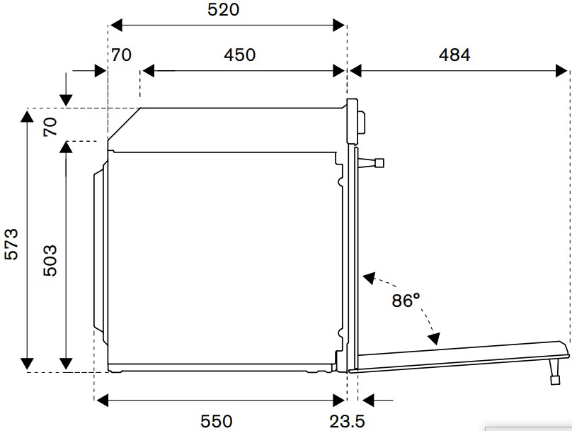 Глубина духовых шкафов, в отличие от их высоты и ширины, не отличается разнообразием. Стандартное значение составляет 54-55 см, что позволяет встраивать устройство в обычную кухонную тумбу или колонну глубиной 60 см так, чтобы оставалось достаточно места до задней стенки мебели или стены кухни для обеспечения нормальной вентиляции. В инструкциях по установке указывается, что это расстояние должно составить не менее 4–5 см. Объем такой духовки может быть равен от 50 до 70 литров.
