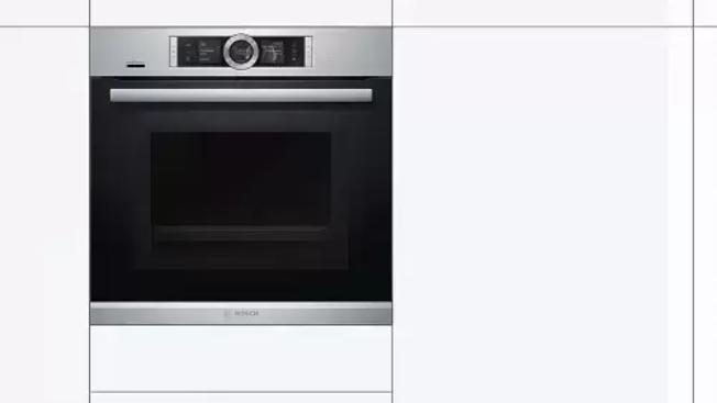 Доводчик дверцы SoftClose с амортизирующими петлями в духовых шкафах Bosch позволяет легко и бесшумно закрывать ее, не прилагая усилий. Дверца не будет хлопать, даже если ее отпустить, доводчик самостоятельно закроет ее и зафиксирует или полностью откроет для удобного размещения противней.
