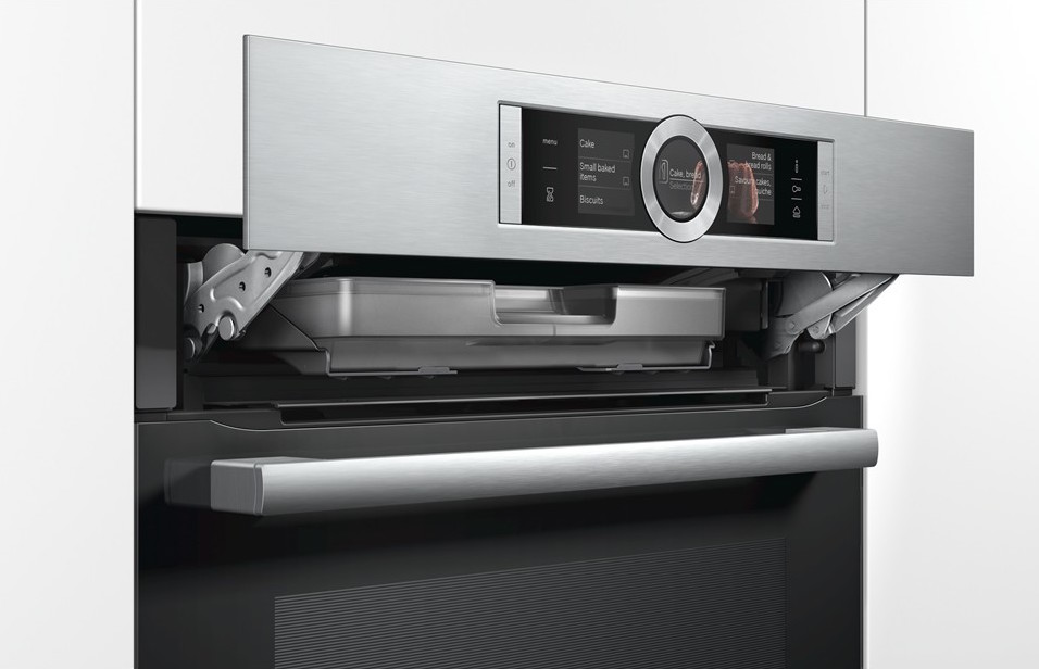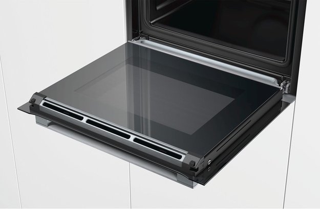 Доводчик дверцы SoftClose с амортизирующими петлями в духовых шкафах Bosch позволяет легко и бесшумно закрывать ее, не прилагая усилий. Дверца не будет хлопать, даже если ее отпустить, доводчик самостоятельно закроет ее и зафиксирует или полностью откроет для удобного размещения противней.