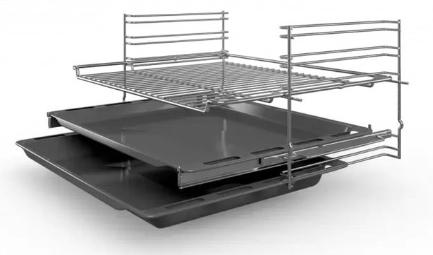 В стандартную комплектацию любого духового шкафа входят один или два противня — эмалированных или с антипригарным покрытием — и решетка. Единственный противень, как правило, имеет низкие бортики и предназначается для приготовления выпечки. Если духовка комплектуется двумя противнями, то второй отличается более высокими бортиками — его можно использовать для запекания мяса, птицы, овощных блюд. На решетке в духовке, не оснащенной грилем, обычно устанавливаются формы для запекания — стальные, керамические или стеклянные. В духовках премиум-класса количество противней может быть увеличено: к стандартному комплекту добавляются противни с перфорацией для мяса, специальные поддоны для сбора выделившегося сока.
