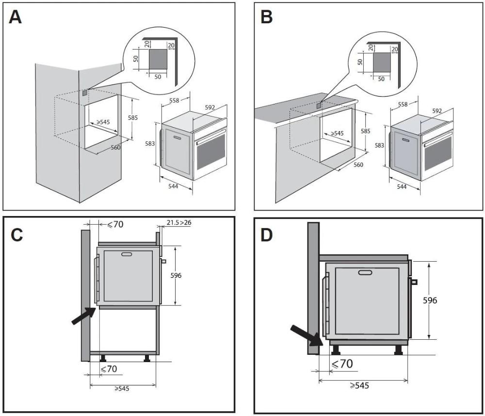 При установке духового шкафа в тумбу необходим также зазор между прибором и полом не менее 8–10 см. Если же она устанавливается в колонну, следует убедиться, что при открывании дверцы в лицо не будет ударять горячий воздух, а панель управления легко доступна. Кроме того, необходимо обеспечить свободный доступ ко всем розеткам и кабелям — они не должны размещаться непосредственно за задней стенкой духового шкафа.