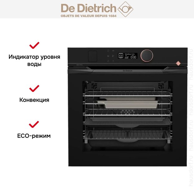 Количество режимов работы в духовом шкафу Де Дитрих: 23. В число доступных программ входят: классический нагрев, конвекция, дополнительное использование пара, гриль для создания хрустящей корочки, сушка для овощей и фруктов, и другие. Помимо основных программ воспользуйтесь специальными возможностями этого прибора: размораживанием продуктов, чтобы сократить время на подготовку; режимом Sous-Vide для приготовления нежных, диетических блюд в вакуумной упаковке; поддержанием температуры в камере на определенном уровне, чтобы блюда не остывали; и другими. Тип гриля в этой модели — электрический.