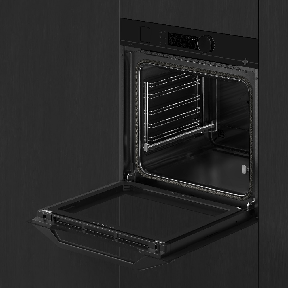 Особенности дизайна и внешней панели управления — также важный пункт при выборе духовки на кухню. В данной модели нужно обратить внимание на цвет — черный, охлаждение двери, чтобы поверхность и мебель вокруг не нагревались.