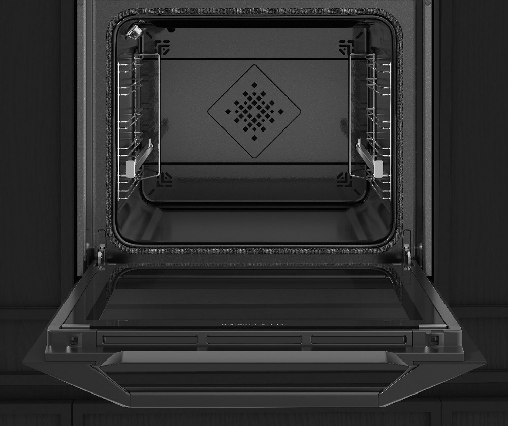 Особенности дизайна и внешней панели управления — также важный пункт при выборе духовки на кухню. В данной модели нужно обратить внимание на цвет — черный, охлаждение двери, чтобы поверхность и мебель вокруг не нагревались.