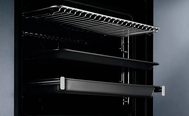 Наиболее удобны телескопические направляющие: они представляют собой металлические опоры, на которых противень не только устанавливается в камере, но и может выдвигаться за ее пределы. Они являются наиболее безопасными, ведь пользователю достаточно потянуть за переднюю часть противня, используя прихватку или полотенце, чтобы полностью извлечь его наружу. Более того, благодаря специальному фиксатору противень можно оставить остывать прямо на направляющих. Единственный недостаток этих направляющих — достаточно сложная конструкция, несколько затрудняющая их очистку.