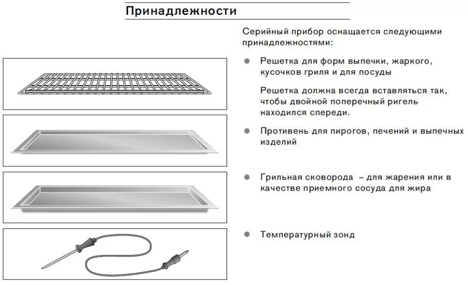 Комплектация духовых шкафов подразумевает набор аксессуаров, которые позволяют воспользоваться всеми имеющимися режимами приготовления. Состав комплекта зависит от фирмы-производителя, ценовой категории устройства, от представленных в духовке режимов нагрева и дополнительных опций. Полное описание комплекта поставки можно найти в руководстве пользователя.