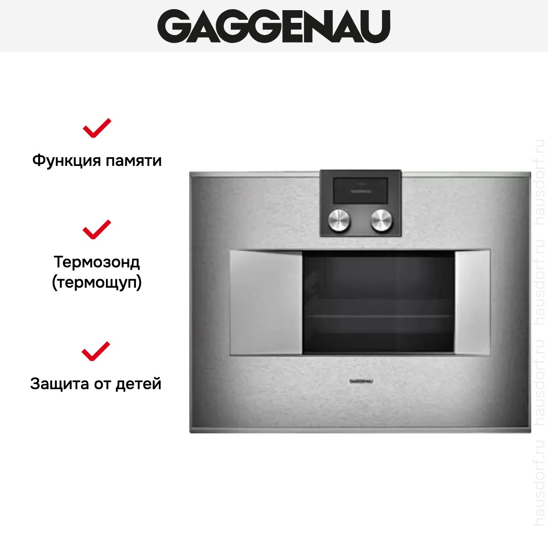Количество режимов работы в духовом шкафу Гаггенау: 13. В число доступных программ входят: конвекция, тушение, брожение, дополнительное использование пара, гриль для создания хрустящей корочки, и другие. Помимо основных программ воспользуйтесь специальными возможностями этого прибора: размораживанием продуктов, чтобы сократить время на подготовку; опцией автоматического поднятия теста; быстрым разогревом для ускорения работы; поддержанием температуры в камере на определенном уровне, чтобы блюда не остывали; и другими. Тип гриля в этой модели — электрический.