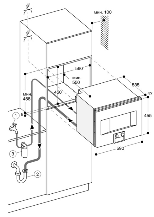 При установке духового шкафа в тумбу необходим также зазор между прибором и полом не менее 8–10 см. Если же она устанавливается в колонну, следует убедиться, что при открывании дверцы в лицо не будет ударять горячий воздух, а панель управления легко доступна. Кроме того, необходимо обеспечить свободный доступ ко всем розеткам и кабелям — они не должны размещаться непосредственно за задней стенкой духового шкафа.