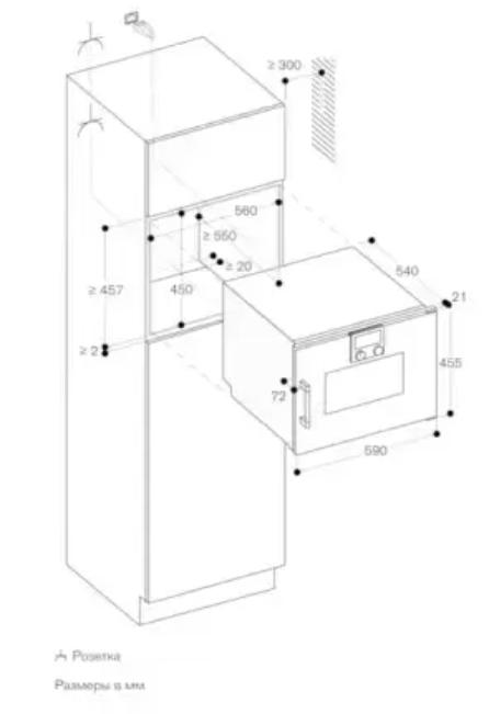 При установке духового шкафа в тумбу необходим также зазор между прибором и полом не менее 8–10 см. Если же она устанавливается в колонну, следует убедиться, что при открывании дверцы в лицо не будет ударять горячий воздух, а панель управления легко доступна. Кроме того, необходимо обеспечить свободный доступ ко всем розеткам и кабелям — они не должны размещаться непосредственно за задней стенкой духового шкафа.