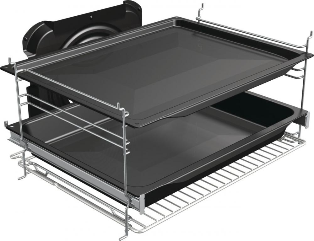 В стандартную комплектацию любого духового шкафа входят один или два противня — эмалированных или с антипригарным покрытием — и решетка. Единственный противень, как правило, имеет низкие бортики и предназначается для приготовления выпечки. Если духовка комплектуется двумя противнями, то второй отличается более высокими бортиками — его можно использовать для запекания мяса, птицы, овощных блюд. На решетке в духовке, не оснащенной грилем, обычно устанавливаются формы для запекания — стальные, керамические или стеклянные. В духовках премиум-класса количество противней может быть увеличено: к стандартному комплекту добавляются противни с перфорацией для мяса, специальные поддоны для сбора выделившегося сока.