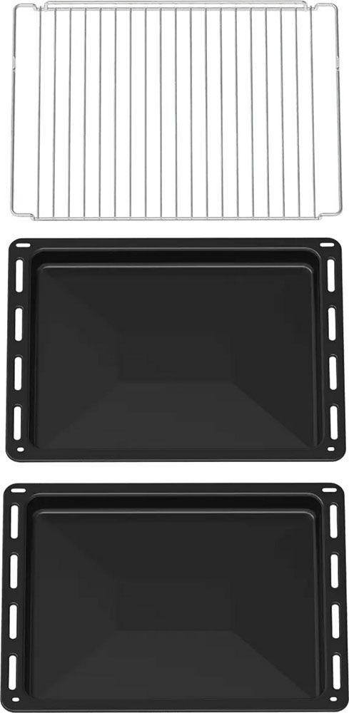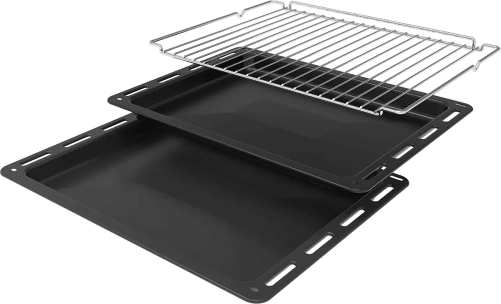 В стандартную комплектацию любого духового шкафа входят один или два противня — эмалированных или с антипригарным покрытием — и решетка. Единственный противень, как правило, имеет низкие бортики и предназначается для приготовления выпечки. Если духовка комплектуется двумя противнями, то второй отличается более высокими бортиками — его можно использовать для запекания мяса, птицы, овощных блюд. На решетке в духовке, не оснащенной грилем, обычно устанавливаются формы для запекания — стальные, керамические или стеклянные. В духовках премиум-класса количество противней может быть увеличено: к стандартному комплекту добавляются противни с перфорацией для мяса, специальные поддоны для сбора выделившегося сока.