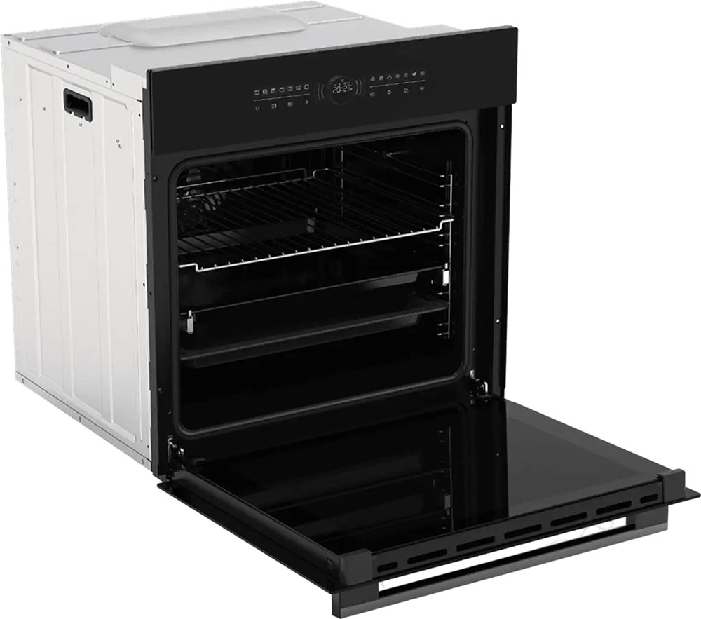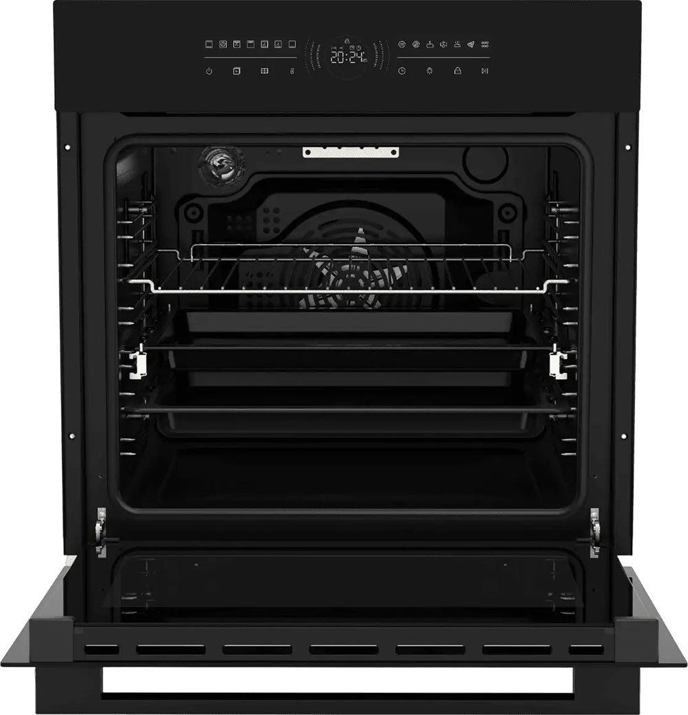 Особенности дизайна и внешней панели управления — также важный пункт при выборе духовки на кухню. В данной модели нужно обратить внимание на цвет — черный матовый,