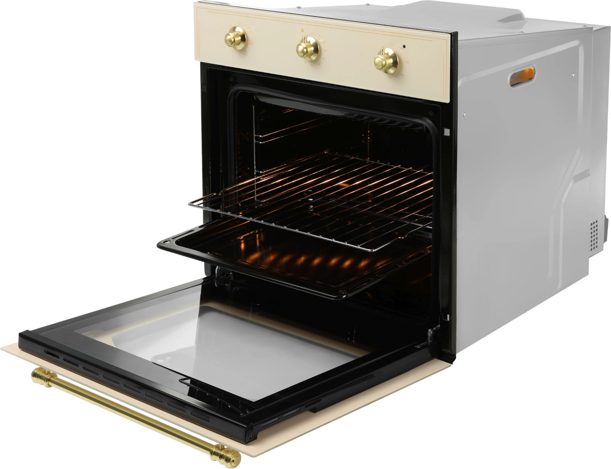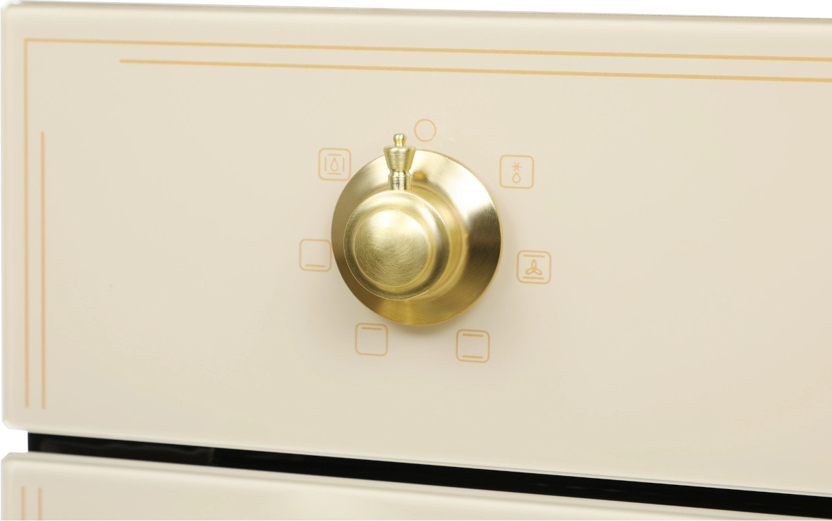 Особенности дизайна и внешней панели управления — также важный пункт при выборе духовки на кухню. В данной модели нужно обратить внимание на цвет — бежевое стекло, Механическая панель управления позволяет быстро разобраться в настройке программ и не требует чрезмерных усилий.
