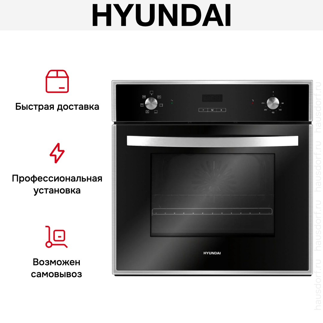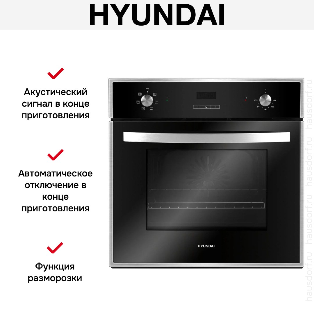 Количество режимов работы в духовом шкафу Хендай: 6. В число доступных программ входят: классический нагрев, нижний нагрев, конвекция, гриль для создания хрустящей корочки, и другие. Помимо основных программ воспользуйтесь специальными возможностями этого прибора: размораживанием продуктов, чтобы сократить время на подготовку; и другими. Тип гриля в этой модели — электрический.