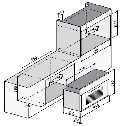 Размеры ниши для встраивания духового шкафа определяются, исходя из габаритов самого устройства. Стандартные модели обычно без труда устанавливаются в нишу шириной около 560 мм, высотой около 595 мм и глубиной примерно 550 мм. Следует помнить, что фасад устройства должен иметь большие размеры, чем величина ниши.