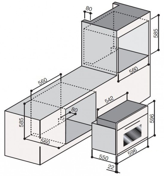 Глубина духовых шкафов, в отличие от их высоты и ширины, не отличается разнообразием. Стандартное значение составляет 54-55 см, что позволяет встраивать устройство в обычную кухонную тумбу или колонну глубиной 60 см так, чтобы оставалось достаточно места до задней стенки мебели или стены кухни для обеспечения нормальной вентиляции. В инструкциях по установке указывается, что это расстояние должно составить не менее 4–5 см. Объем такой духовки может быть равен от 50 до 70 литров.