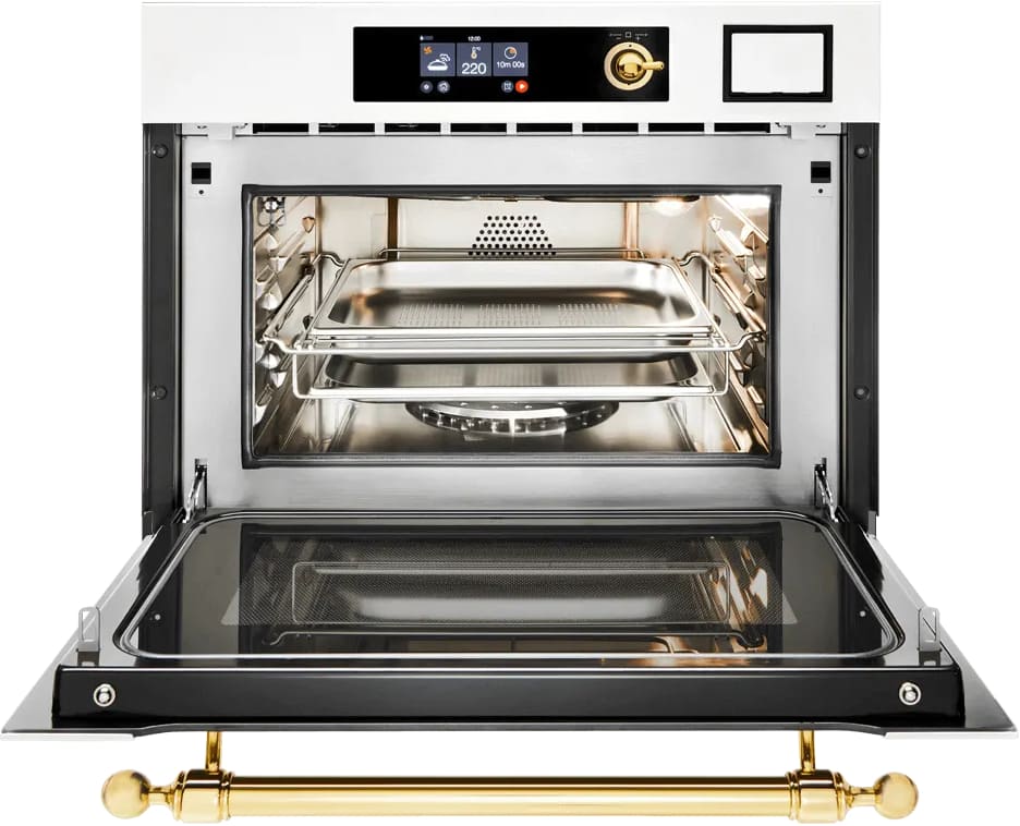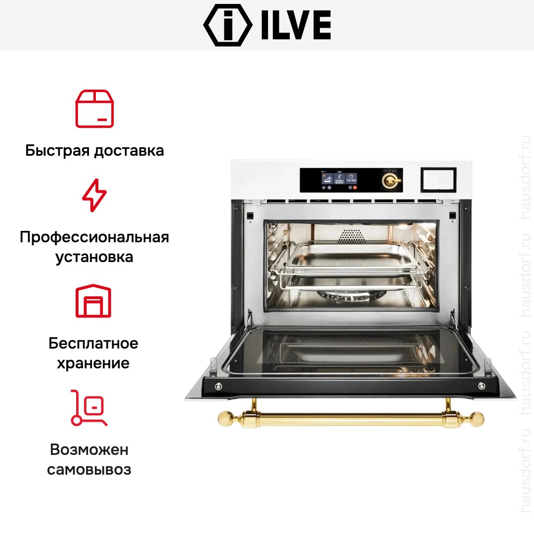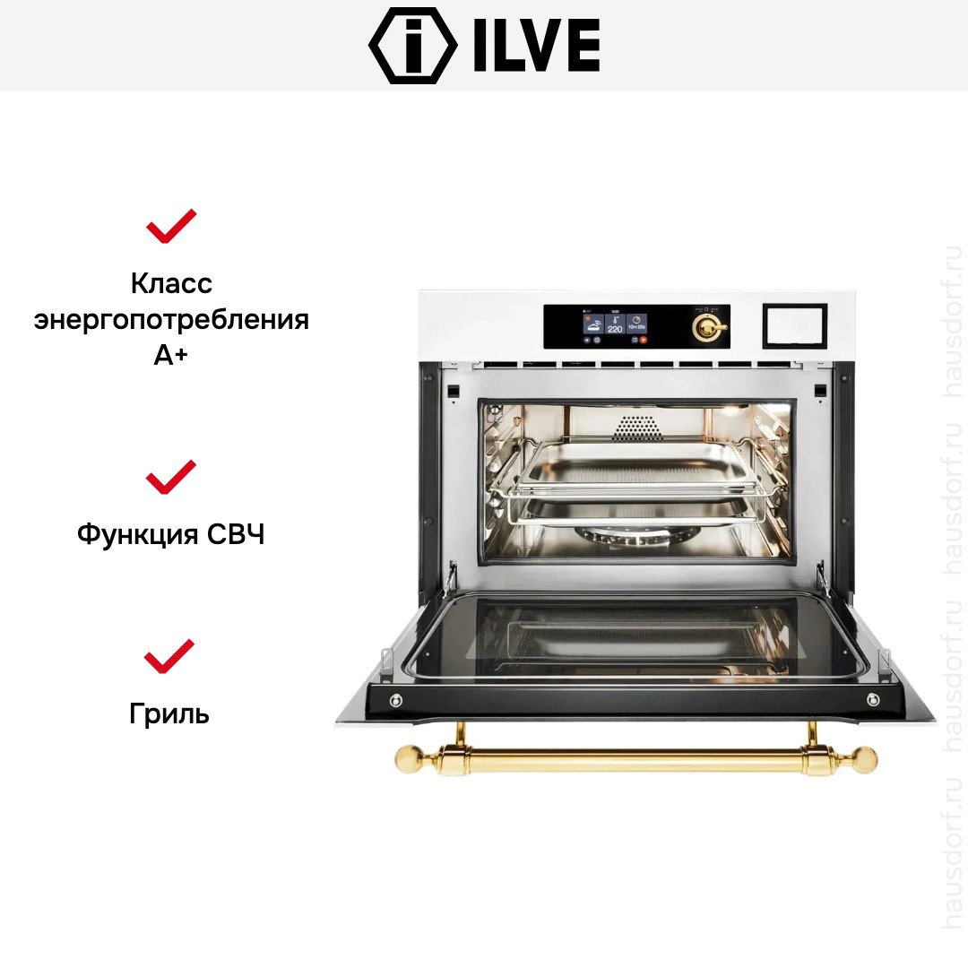 Количество режимов работы в духовом шкафу Илве: 10. В число доступных программ входят: конвекция, приготовление с помощью микроволн, дополнительное использование пара, гриль для создания хрустящей корочки, и другие. Тип гриля в этой модели — электрический.