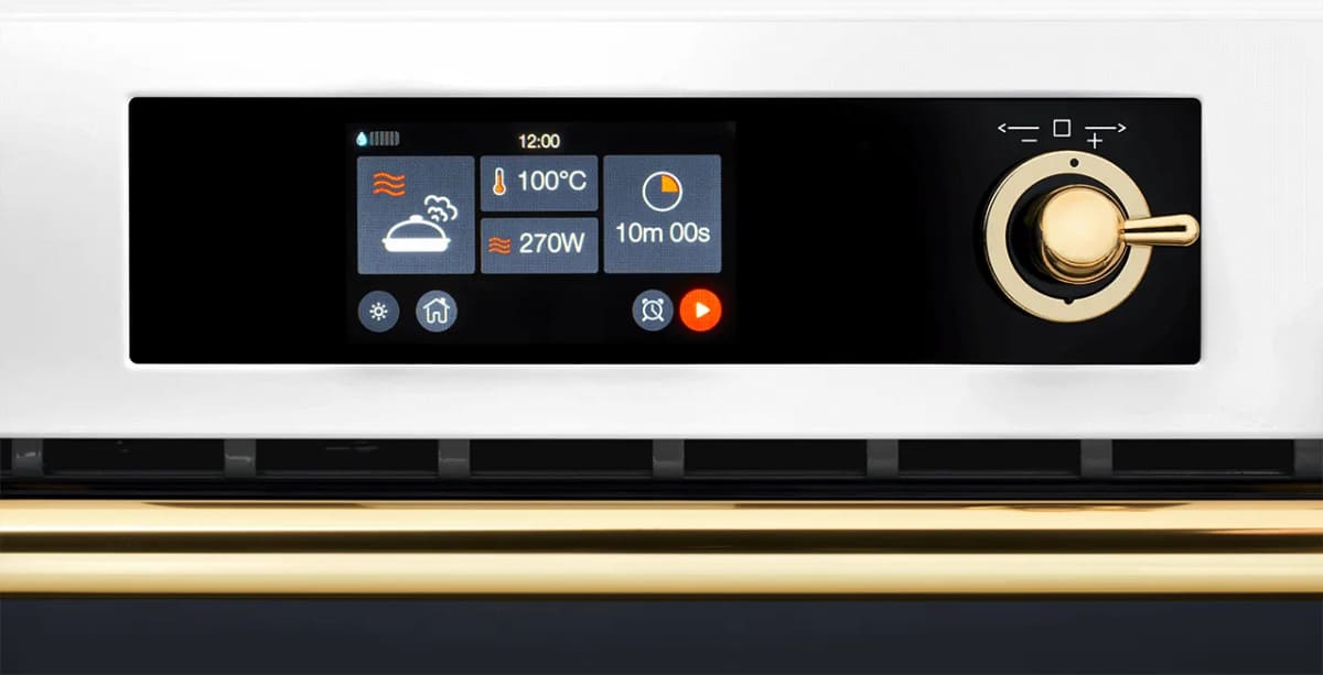 По способу управления можно выделить механические, электронные и сенсорные панели. Дисплеи присутствуют в двух последних вариантах. Электронное управление сочетает дисплей, кнопки и поворотные регуляторы. Сенсорные дисплеи отличаются тем, что все команды в них вводятся прикосновением к той или иной области экрана. Большие многоязычные сенсорные цветные дисплеи с выводом изображений и анимации — принадлежность духовок премиум-класса. Сенсорное управление позволяет работать с интерактивным меню, использовать встроенные книги рецептов, получать подсказки при приготовлении тех или иных продуктов и даже сохранять фотографии любимых блюд.