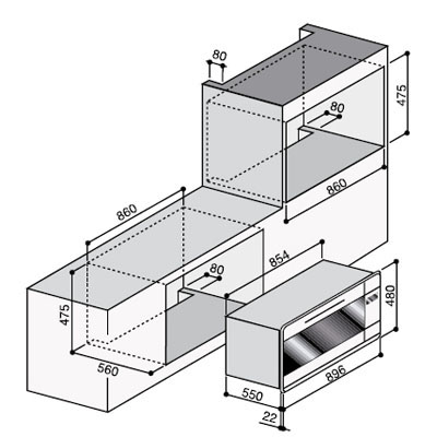 Размеры ниши для встраивания духового шкафа определяются, исходя из габаритов самого устройства. Стандартные модели обычно без труда устанавливаются в нишу шириной около 560 мм, высотой около 595 мм и глубиной примерно 550 мм. Следует помнить, что фасад устройства должен иметь большие размеры, чем величина ниши.