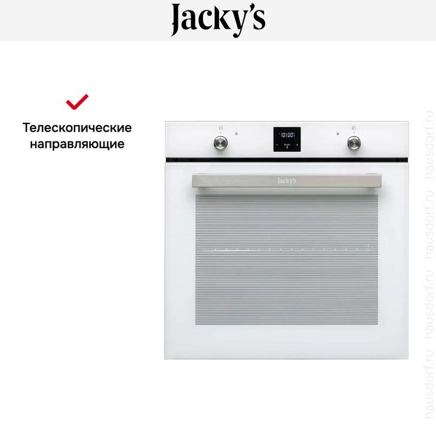 Jacky’s JO EW7538 — электрический духовой шкаф, выполненный в белом цвете. Имеет 8 режимов работы, среди которых конвекция и гриль. Благодаря задней стенке с каталитическим покрытием, ускоряющим расщепление жиров, уход за устройством не составит большого труда. 3 стекла в дверце предохранят от случайных ожогов. Управление осуществляется с помощью удобных утапливаемых переключателей с подсветкой.