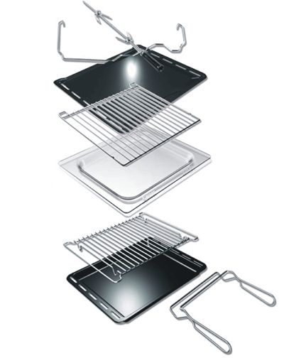 В стандартную комплектацию любого духового шкафа входят один или два противня — эмалированных или с антипригарным покрытием — и решетка. Единственный противень, как правило, имеет низкие бортики и предназначается для приготовления выпечки. Если духовка комплектуется двумя противнями, то второй отличается более высокими бортиками — его можно использовать для запекания мяса, птицы, овощных блюд. На решетке в духовке, не оснащенной грилем, обычно устанавливаются формы для запекания — стальные, керамические или стеклянные. В духовках премиум-класса количество противней может быть увеличено: к стандартному комплекту добавляются противни с перфорацией для мяса, специальные поддоны для сбора выделившегося сока.