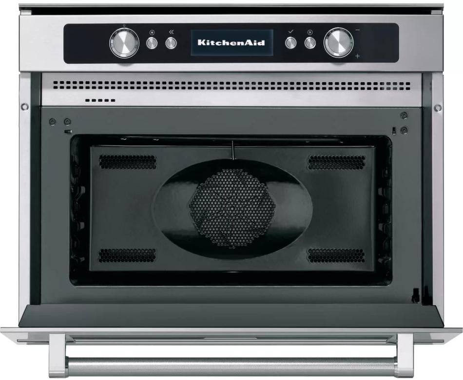 Духовой шкаф Kitchen Aid KOCCX 45600 цвета «нержавеющая сталь» органично смотрится в интерьере современной кухни. Конструкция прибора предусматривает сочетание режимов «Конвекция» и «Микроволны», что ускоряет процесс приготовления. Дверца духовки всегда остается холодной за счет четырехслойного остекления, что гарантирует безопасность эксплуатации.