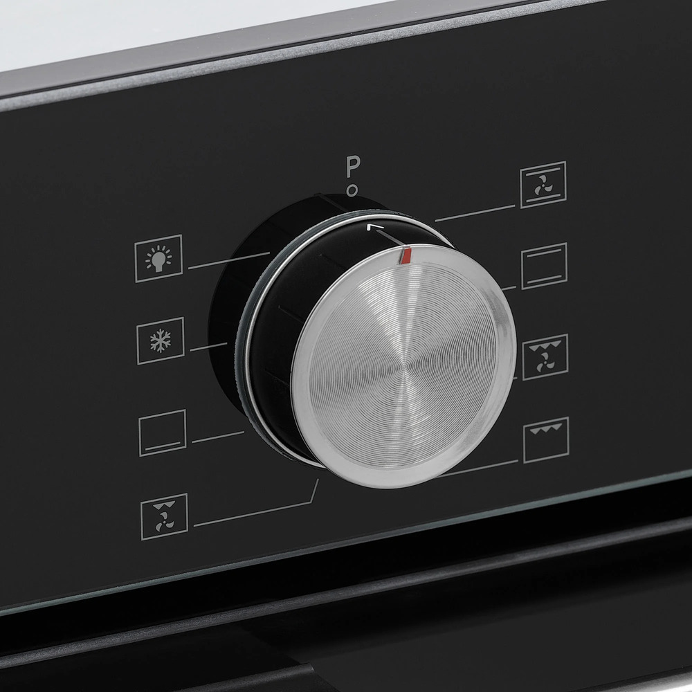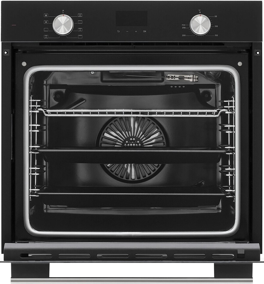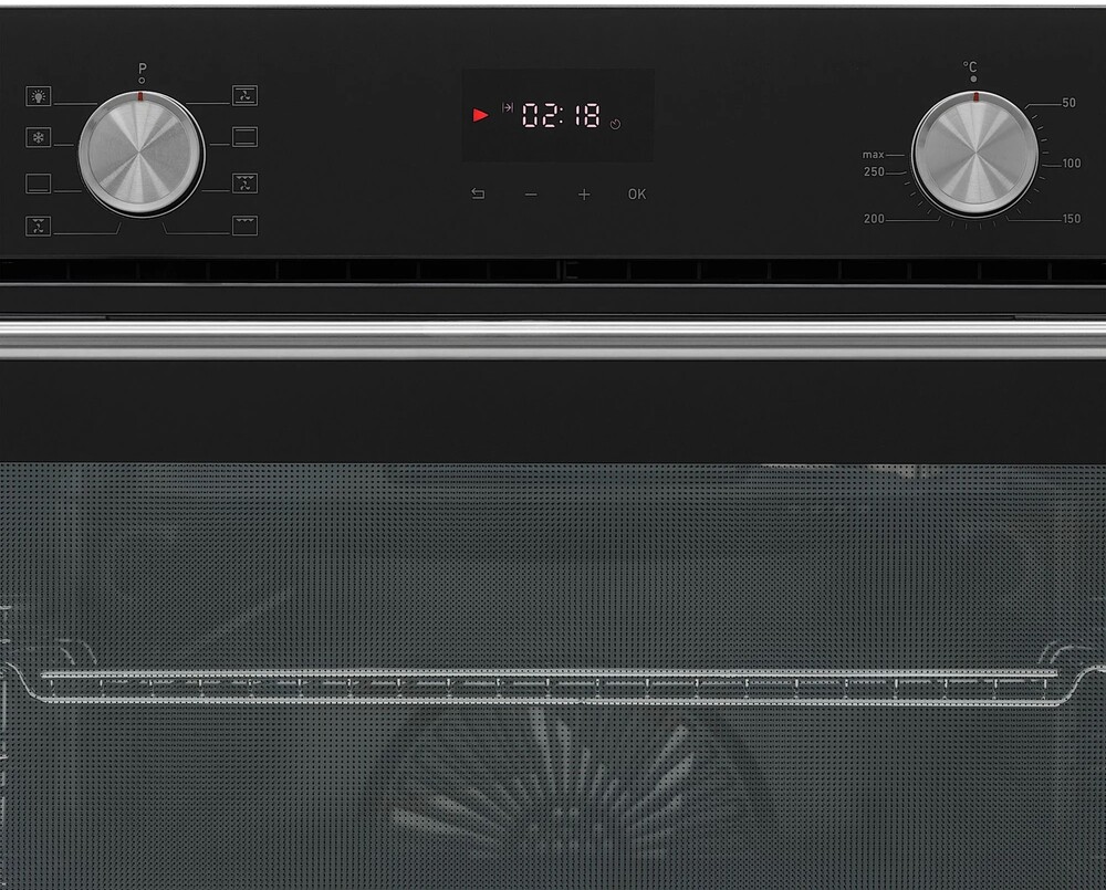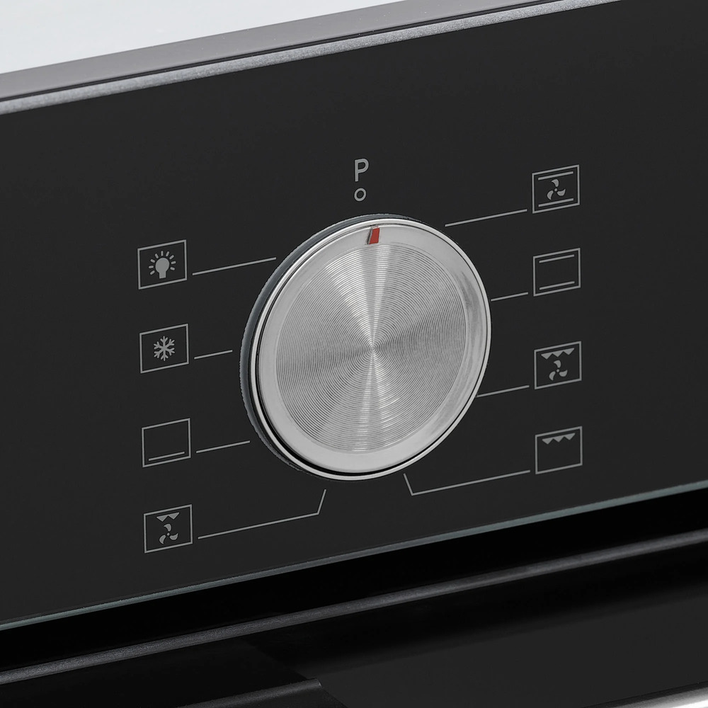 Особенности дизайна и внешней панели управления — также важный пункт при выборе духовки на кухню. В данной модели нужно обратить внимание на цвет — черный, охлаждение двери, чтобы поверхность и мебель вокруг не нагревались.